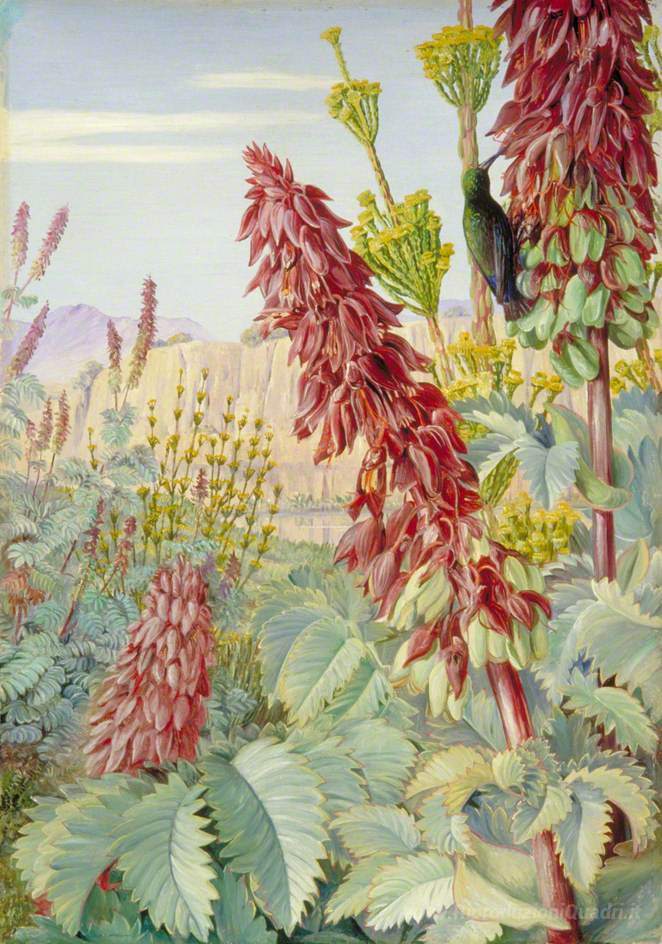 Ti offriamo una riproduzione artigianale su tela dell'opera famosa 'Touch-Me-Not Zucchero-Birds e a Tulbagh, Sudafrica' di Marianne North, dal Museo delle Riproduzioni.