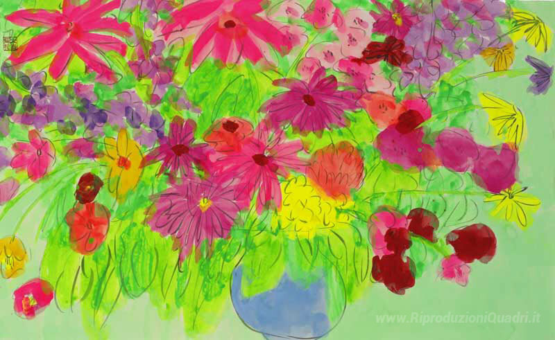 Ti offriamo una riproduzione artigianale su tela dell'opera famosa 'Vaso blu, molti fiori' di Walasse Ting, dal Museo delle Riproduzioni.