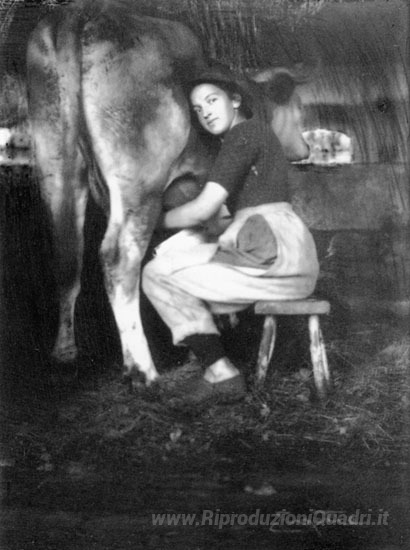 Ti offriamo una riproduzione artigianale su tela dell'opera famosa 'Donna mungitura della mucca' di Frank Eugene, dal Museo delle Riproduzioni.