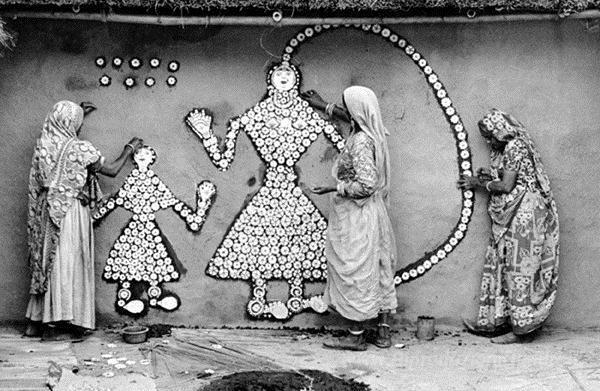 Ti offriamo una riproduzione artigianale su tela dell'opera famosa 'Le donne facendo una immagine Samha Devi, Haryana' di Jyoti Bhatt, dal Museo delle Riproduzioni.