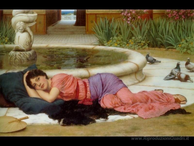 Ti offriamo una riproduzione artigianale su tela dell'opera famosa 'A Cool Retreat' di John William Godward, dal Museo delle Riproduzioni.