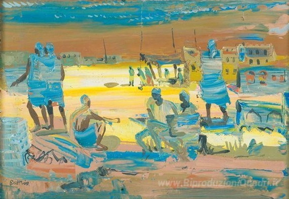 Ti offriamo una riproduzione artigianale su tela dell'opera famosa 'A Gathering' di Walter Battiss, dal Museo delle Riproduzioni.