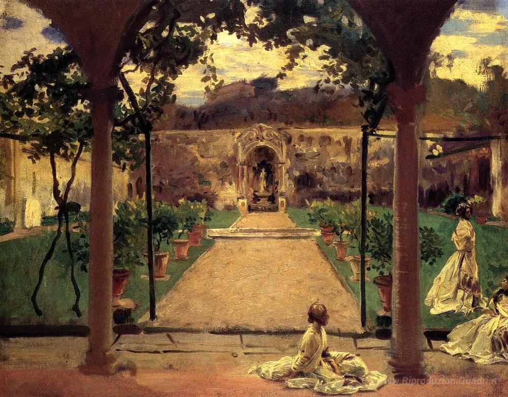 Ti offriamo una riproduzione artigianale su tela dell'opera famosa 'A Torre Galli. Donne in un giardino' di John Singer Sargent, dal Museo delle Riproduzioni.
