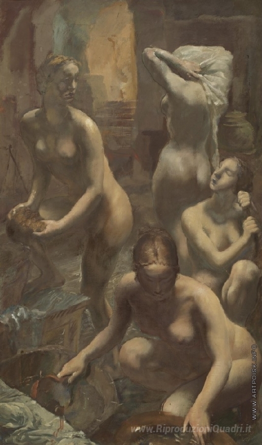 Ti offriamo una riproduzione artigianale su tela dell'opera famosa 'Al bagno casa' di Alexandre Jacovleff, dal Museo delle Riproduzioni.