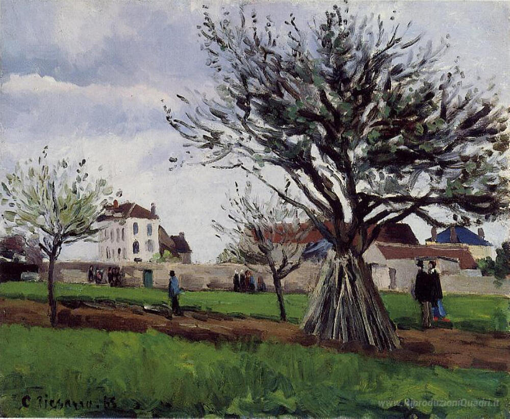Ti offriamo una riproduzione artigianale su tela dell'opera famosa 'Alberi di mele a Pontoise' di Camille Pissarro, dal Museo delle Riproduzioni.