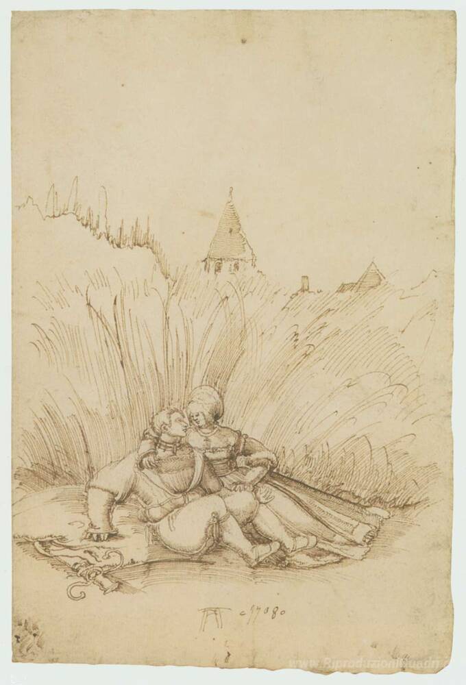 Ti offriamo una riproduzione artigianale su tela dell'opera famosa 'Amanti in un campo di fieno' di Albrecht Altdorfer, dal Museo delle Riproduzioni.
