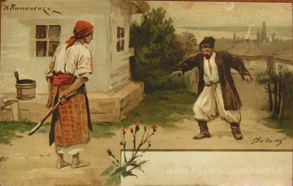 Ti offriamo una riproduzione artigianale su tela dell'opera famosa 'Andando a casa' di Mykola Pymonenko, dal Museo delle Riproduzioni.