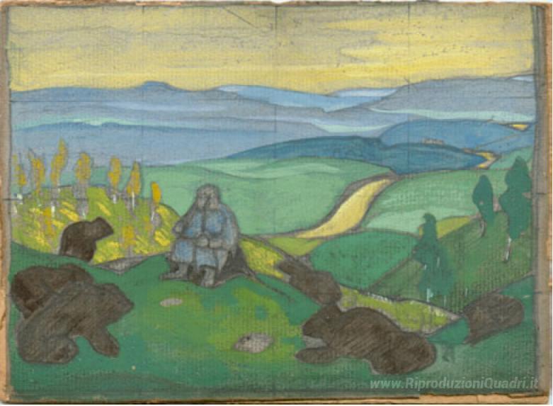 Ti offriamo una riproduzione artigianale su tela dell'opera famosa 'Antenati umani (studio)' di Nicholas Roerich, dal Museo delle Riproduzioni.