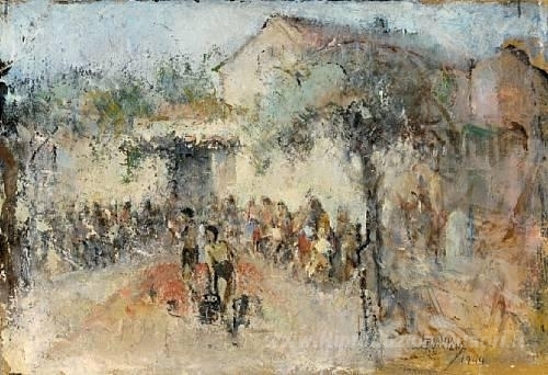 Ti offriamo una riproduzione artigianale su tela dell'opera famosa 'Aperto air show' di Theophrastos Triantafyllidis, dal Museo delle Riproduzioni.