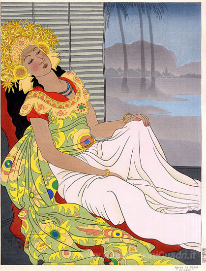 Ti offriamo una riproduzione artigianale su tela dell'opera famosa 'Apres La Danse, Celebes' di Paul Jacoulet, dal Museo delle Riproduzioni.