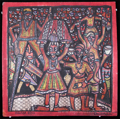 Ti offriamo una riproduzione artigianale su tela dell'opera famosa 'Arugba Osun' di Twins Seven Seven, dal Museo delle Riproduzioni.