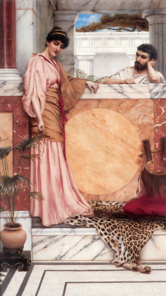 Ti offriamo una riproduzione artigianale su tela dell'opera famosa 'Aspettando una risposta' di John William Godward, dal Museo delle Riproduzioni.