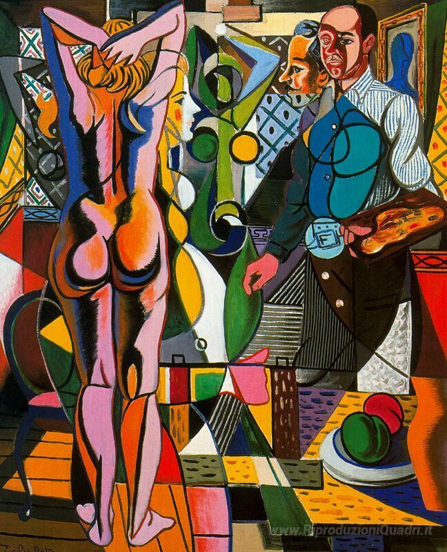 Ti offriamo una riproduzione artigianale su tela dell'opera famosa 'Autoritratto con il modello e la natura morta' di Rafael Zabaleta, dal Museo delle Riproduzioni.