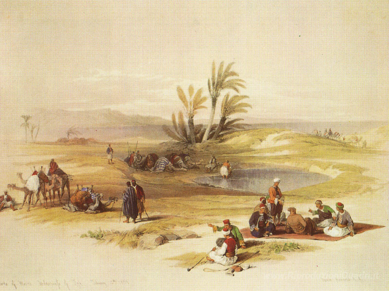 Ti offriamo una riproduzione artigianale su tela dell'opera famosa 'Ayn Mousa. The Wells di Mosè' di David Roberts, dal Museo delle Riproduzioni.