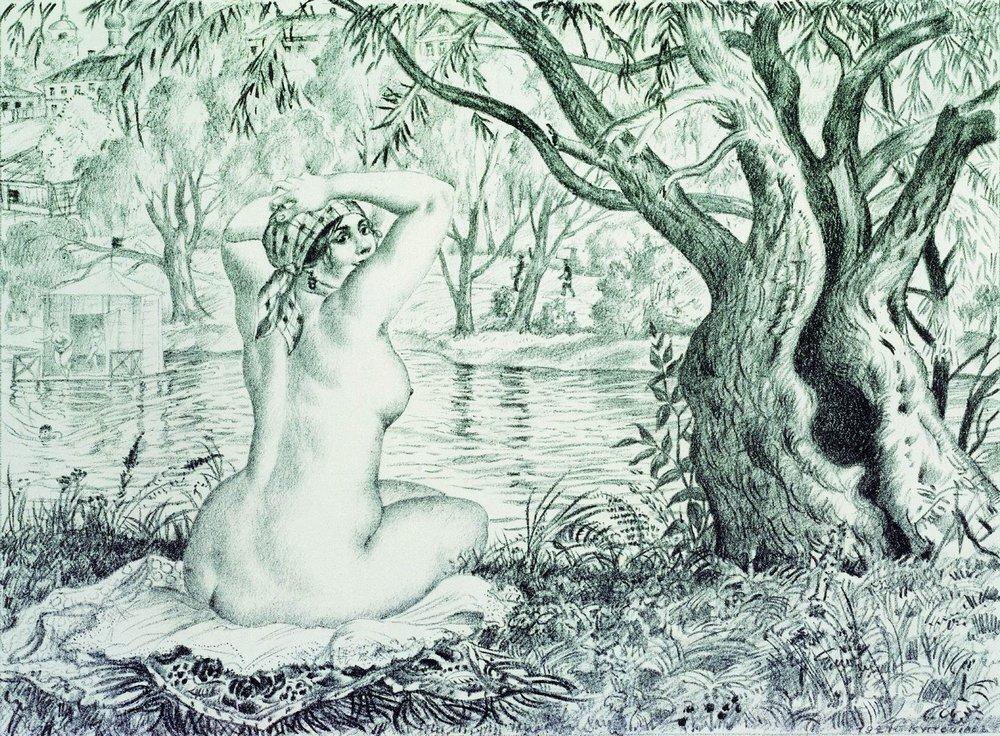 Ti offriamo una riproduzione artigianale su tela dell'opera famosa 'Bagnante' di Boris Kustodiev, dal Museo delle Riproduzioni.