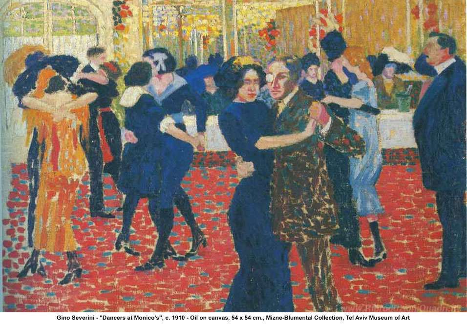 Ti offriamo una riproduzione artigianale su tela dell'opera famosa 'Ballerini in Monicos' di Gino Severini, dal Museo delle Riproduzioni.
