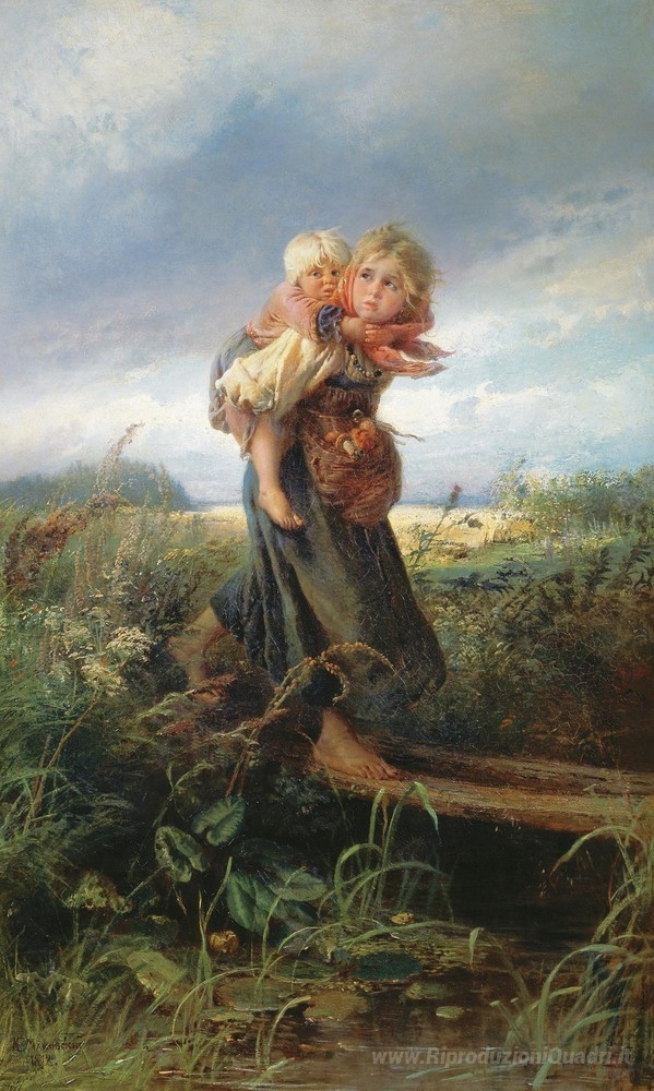 Ti offriamo una riproduzione artigianale su tela dell'opera famosa 'Bambini che corrono dalla tempesta' di Konstantin Makovsky, dal Museo delle Riproduzioni.
