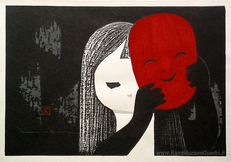 Ti offriamo una riproduzione artigianale su tela dell'opera famosa 'Bambino e Maschera' di Kaoru Kawano, dal Museo delle Riproduzioni.