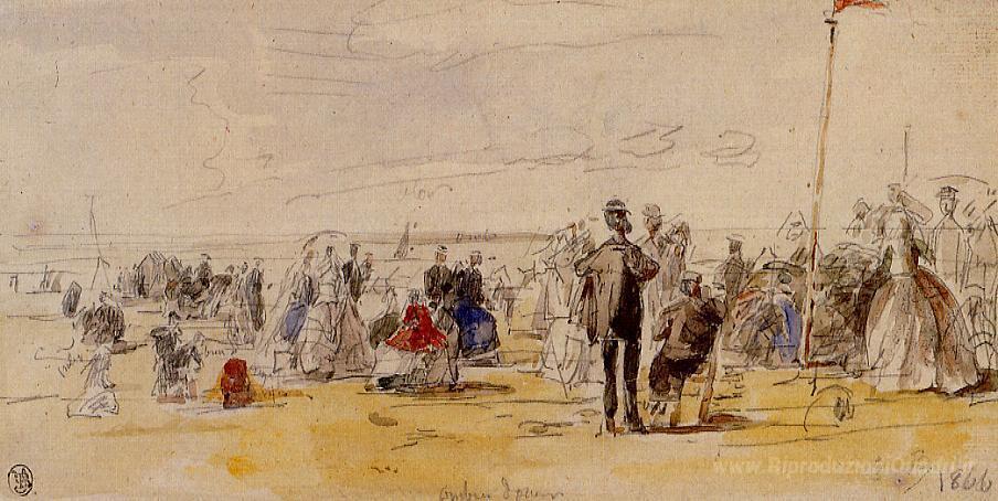 Ti offriamo una riproduzione artigianale su tela dell'opera famosa 'Beach Scene a Trouville' di Eugene Boudin, dal Museo delle Riproduzioni.