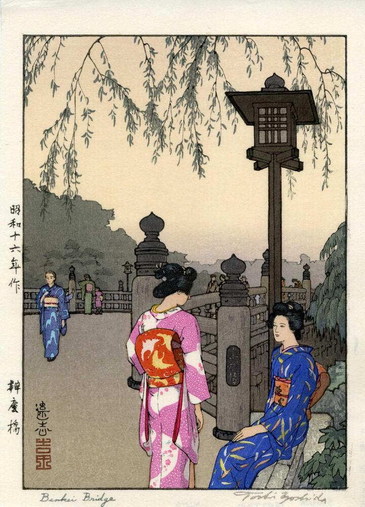 Ti offriamo una riproduzione artigianale su tela dell'opera famosa 'Benkei Ponte' di Toshi Yoshida, dal Museo delle Riproduzioni.