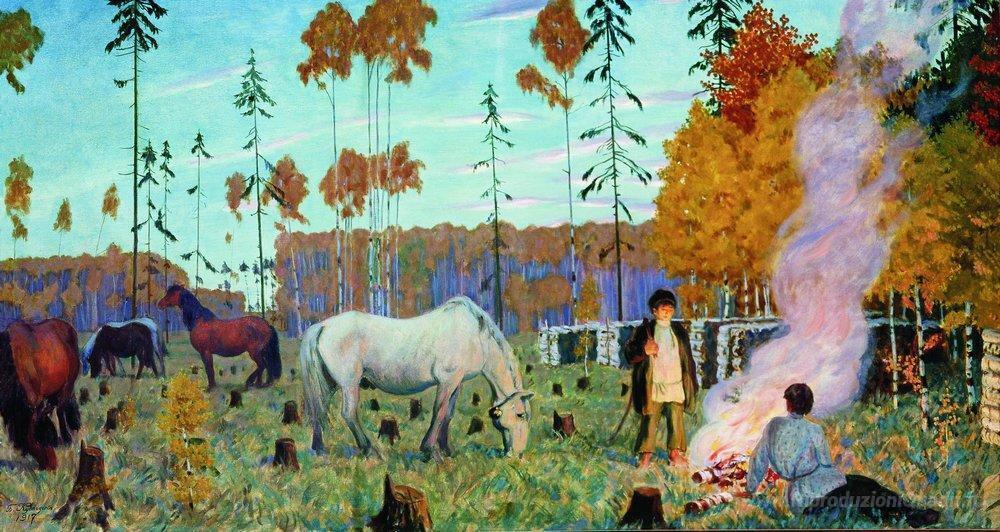 Ti offriamo una riproduzione artigianale su tela dell'opera famosa 'Camino (Notte)' di Boris Kustodiev, dal Museo delle Riproduzioni.