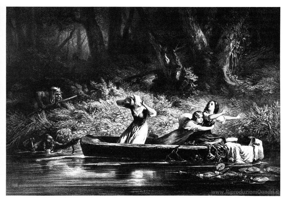 Ti offriamo una riproduzione artigianale su tela dell'opera famosa 'Cattura delle Figlie di D. Boone e Callaway dagli indiani' di Karl Bodmer, dal Museo delle Riproduzioni.