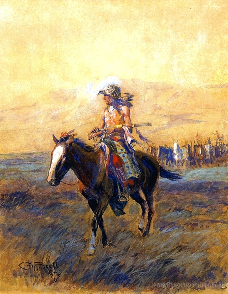 Benvenuti nella nostra esclusiva collezione di dipinti a olio italiani, dove l'arte si fonde con l'eleganza e la tradizione. Tra le opere che stiamo per presentarvi, spicca Cavalleria Monti per the Brave, un capolavoro dell'artista di fama internazionale Charles M. Russell. Russell, celebre per la sua abilità nell'immortalare la vita degli indiani d'America e le scene di cowboy, ci offre un'immagine vibrante e dinamica che racconta storie di coraggio e nobiltà.