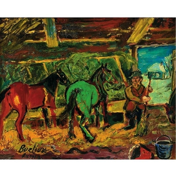 Benvenuti nella nostra selezione di dipinti a olio, dove l'arte incontra l'eleganza italiana. Tra le opere che vi proponiamo, spicca Cavalli rossi e verdi in una stalla, un capolavoro del rinomato artista David Burliuk, considerato il padre dell'avanguardia russa. La sua opera incarna un perfetto equilibrio tra colore e forma, esprimendo una profonda connessione con la natura e una forte passione per il soggetto rappresentato.