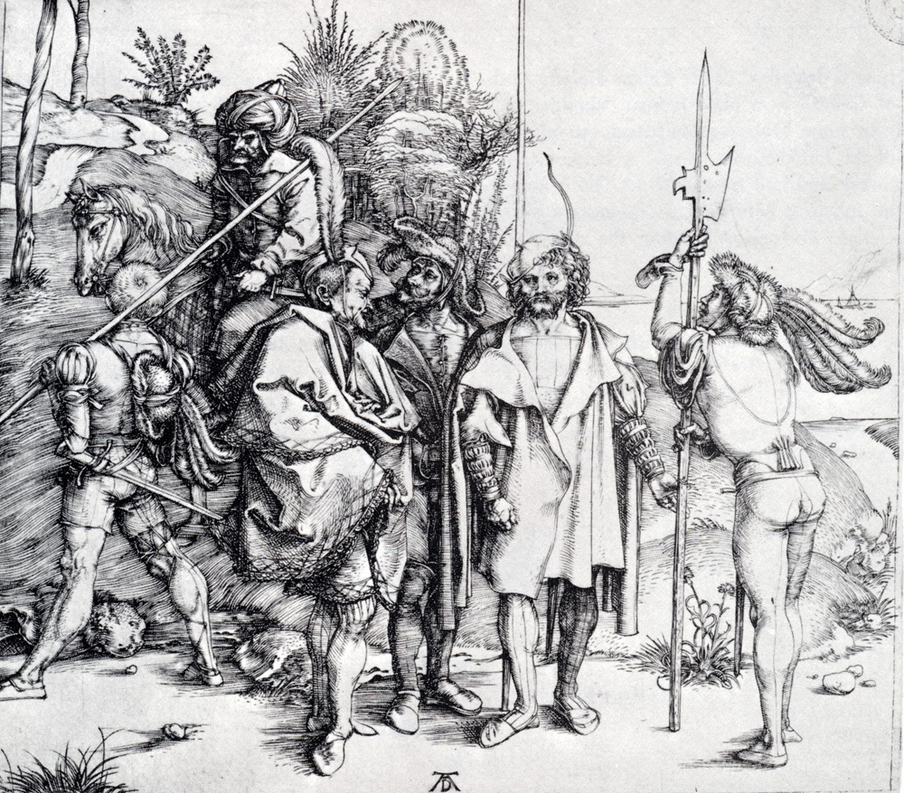 Ti offriamo una riproduzione artigianale su tela dell'opera famosa 'Cinque Lanzichenecchi, un'Oriental A cavallo' di Albrecht Durer, dal Museo delle Riproduzioni.