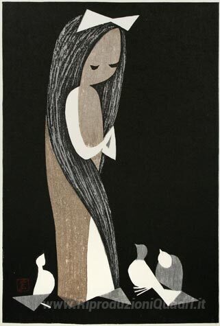 Ti offriamo una riproduzione artigianale su tela dell'opera famosa 'Colombe e Girl' di Kaoru Kawano, dal Museo delle Riproduzioni.