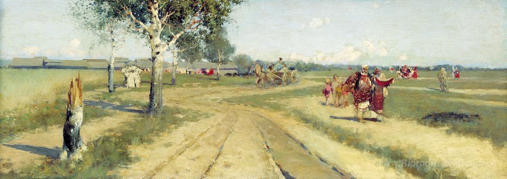 Ti offriamo una riproduzione artigianale su tela dell'opera famosa 'Coming Back da Fair' di Andrei Ryabushkin, dal Museo delle Riproduzioni.