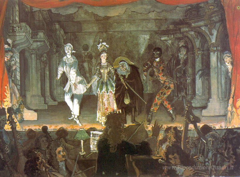 Ti offriamo una riproduzione artigianale su tela dell'opera famosa 'Commedia italiana. "Love Note"' di Alexandre Benois, dal Museo delle Riproduzioni.