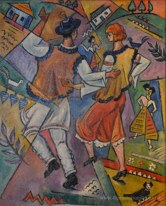 Ti offriamo una riproduzione artigianale su tela dell'opera famosa 'Composizione con motivi rumeni' di Corneliu Michailescu, dal Museo delle Riproduzioni.