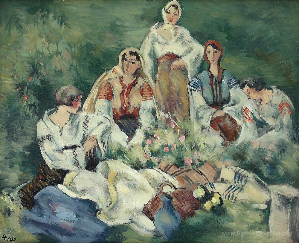 Ti offriamo una riproduzione artigianale su tela dell'opera famosa 'Composizione con Peasant motivi' di Ion Theodorescu-Sion, dal Museo delle Riproduzioni.