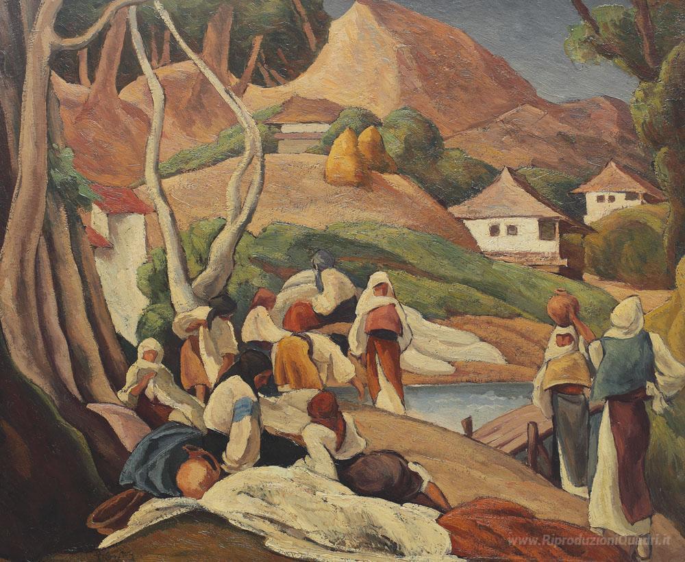 Ti offriamo una riproduzione artigianale su tela dell'opera famosa 'Composizione con Peasant Women at Intersezione' di Ion Theodorescu-Sion, dal Museo delle Riproduzioni.