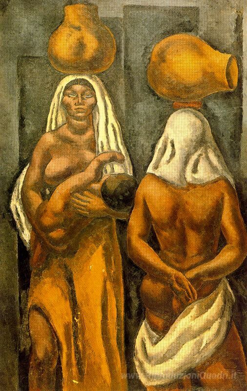 Ti offriamo una riproduzione artigianale su tela dell'opera famosa 'Composizione (mulatti con brocche)' di Arturo Souto, dal Museo delle Riproduzioni.