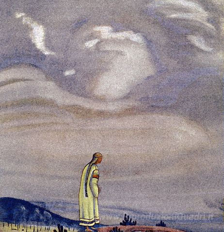 Ti offriamo una riproduzione artigianale su tela dell'opera famosa 'Con il bordo' di Nicholas Roerich, dal Museo delle Riproduzioni.