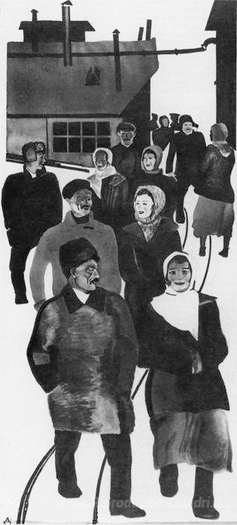 Ti offriamo una riproduzione artigianale su tela dell'opera famosa 'Con il cambiamento' di Aleksandr Deyneka, dal Museo delle Riproduzioni.