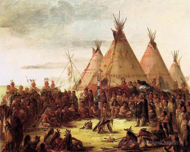 Ti offriamo una riproduzione artigianale su tela dell'opera famosa 'Consiglio di Guerra Sioux' di George Catlin, dal Museo delle Riproduzioni.