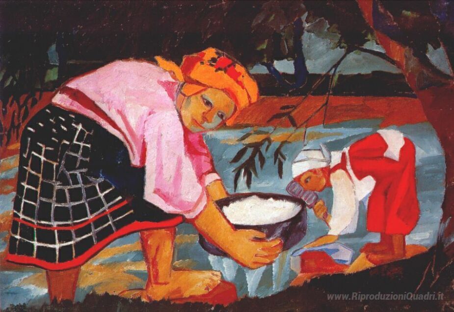 Benvenuti nella nostra esclusiva selezione di dipinti a olio italiani, dove ogni opera racconta una storia unica. Oggi vi presentiamo Contadine, una straordinaria creazione dell'artista Natalia Goncharova, una delle figure più influenti del Novecento. Nata in Russia nel 1881, Goncharova ha saputo fondere tradizione e innovazione, diventando un'icona del movimento avanguardistico. La sua maestria nell'uso del colore e delle forme rende ogni dipinto un'esperienza visiva coinvolgente.