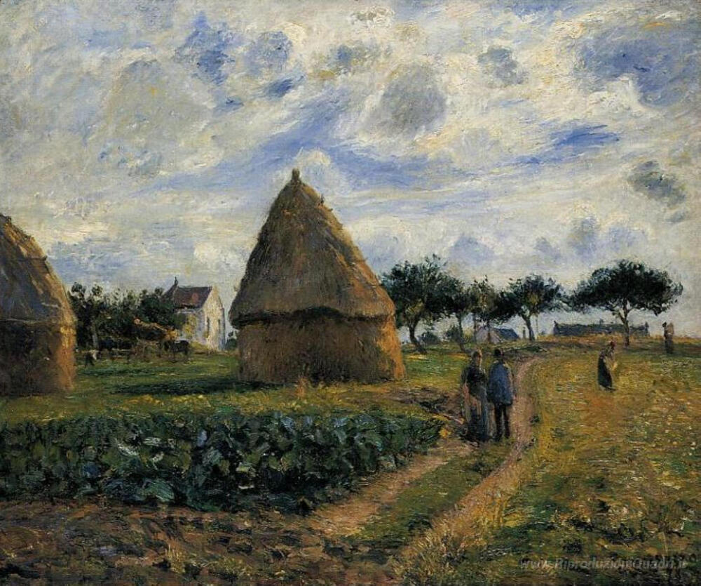 Ti offriamo una riproduzione artigianale su tela dell'opera famosa 'Contadini e pile di fieno' di Camille Pissarro, dal Museo delle Riproduzioni.