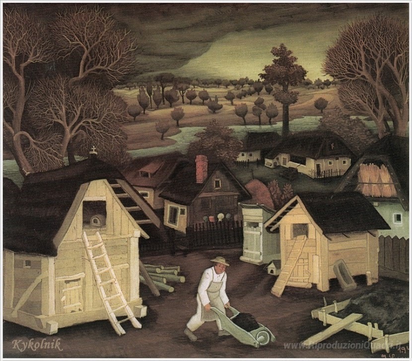 Ti offriamo una riproduzione artigianale su tela dell'opera famosa 'Contadino con carriola' di Ivan Generalic, dal Museo delle Riproduzioni.