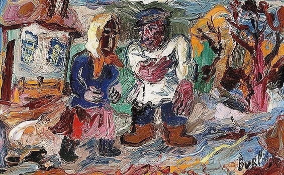 Ti offriamo una riproduzione artigianale su tela dell'opera famosa 'Contadino e sua moglie fuori per una passeggiata' di David Burliuk, dal Museo delle Riproduzioni.