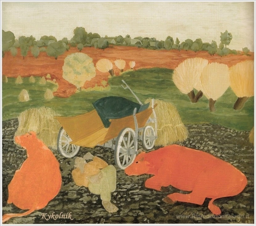 Ti offriamo una riproduzione artigianale su tela dell'opera famosa 'Contadino guardare oltre le mucche' di Ivan Generalic, dal Museo delle Riproduzioni.