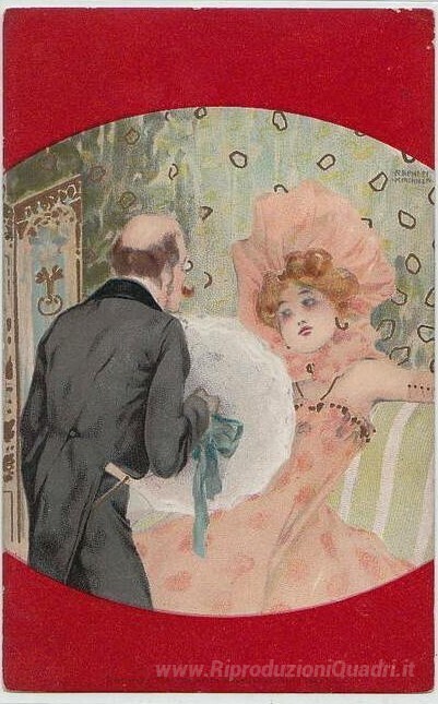 Ti offriamo una riproduzione artigianale su tela dell'opera famosa 'Coppie tra i bordi rossi' di Raphael Kirchner, dal Museo delle Riproduzioni.