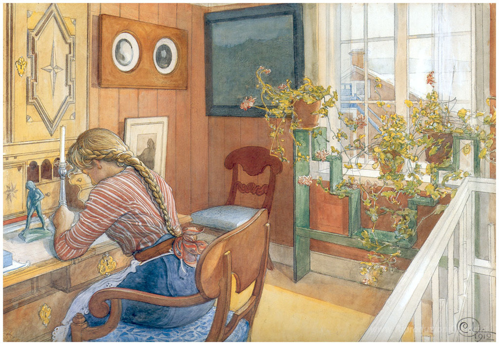 Ti offriamo una riproduzione artigianale su tela dell'opera famosa 'Corrispondenza' di Carl Larsson, dal Museo delle Riproduzioni.