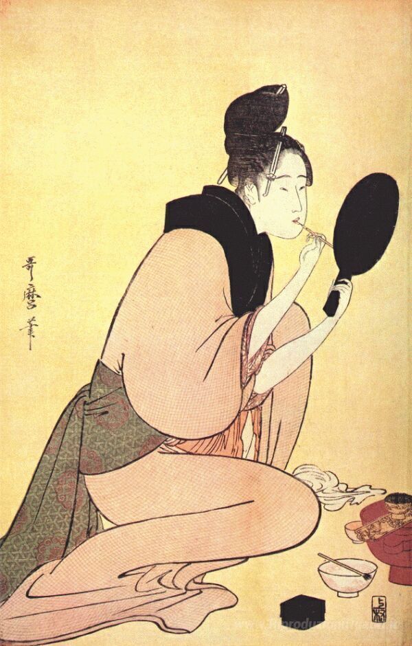 Ti offriamo una riproduzione artigianale su tela dell'opera famosa 'Cortigiana applicando lip rouge' di Kitagawa Utamaro, dal Museo delle Riproduzioni.