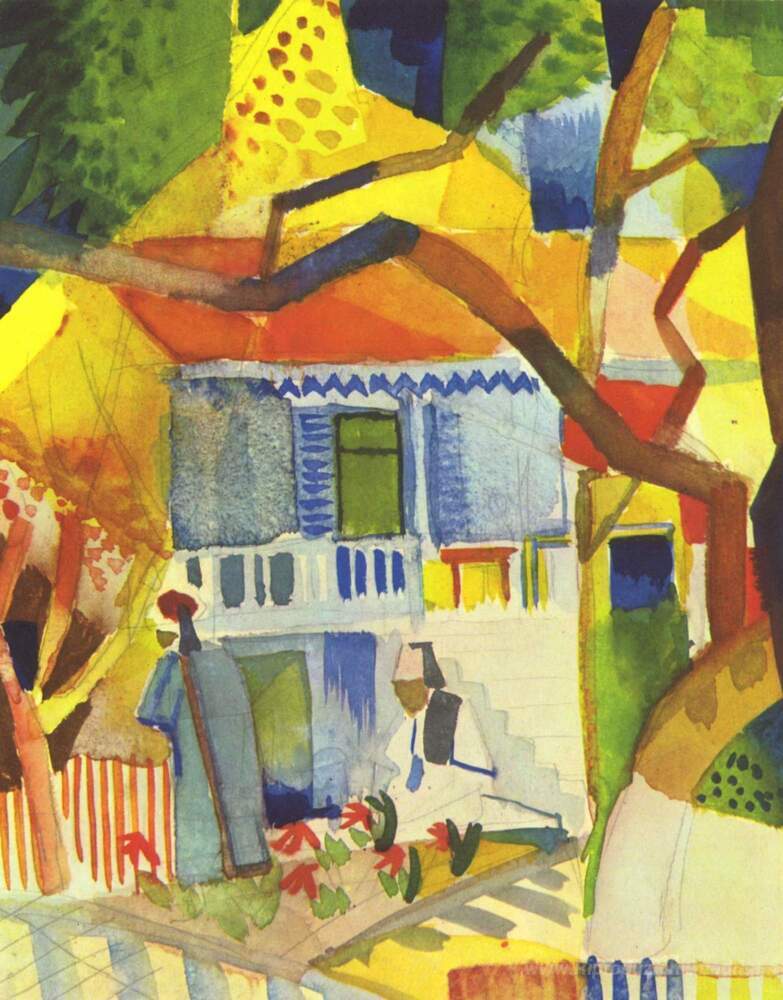 Ti offriamo una riproduzione artigianale su tela dell'opera famosa 'Cortile interno della casa in St. Germain' di August Macke, dal Museo delle Riproduzioni.