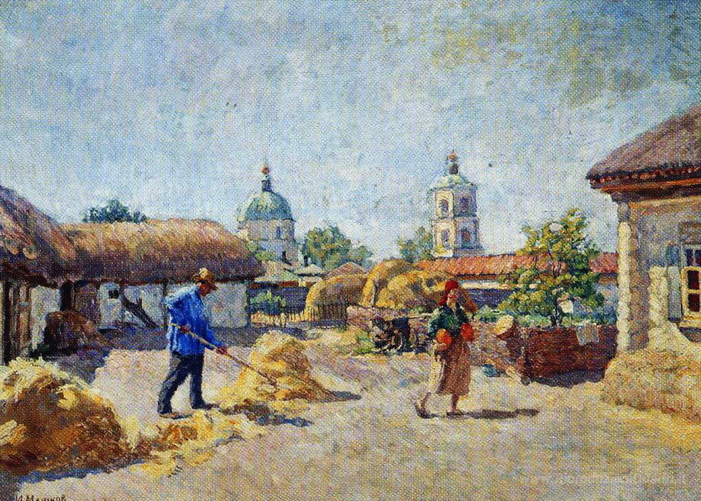 Ti offriamo una riproduzione artigianale su tela dell'opera famosa 'Cortile nel villaggio Mikhailovskaya' di Ilya Mashkov, dal Museo delle Riproduzioni.
