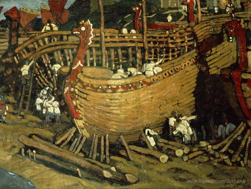 Ti offriamo una riproduzione artigianale su tela dell'opera famosa 'Costruire le navi' di Nicholas Roerich, dal Museo delle Riproduzioni.